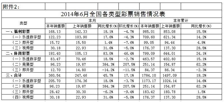 财政部:2014年6月份全国彩票销售数据情况