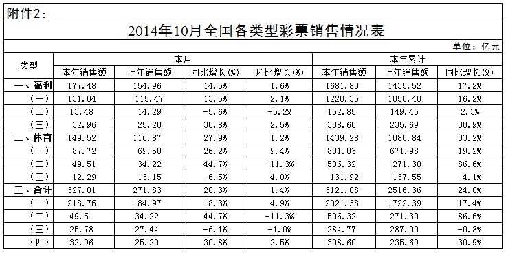 财政部:2014年10月份全国彩票销售数据情况
