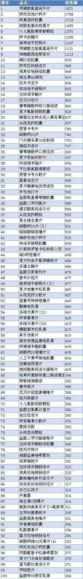 另外,同样是慢性病用药的硫酸氢氯吡格雷片和阿卡波糖片分别位于第4和第6位,它们分别属于抗血栓药物和糖尿病用药。