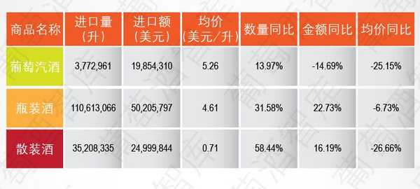 葡萄酒下属的三个品类,瓶装酒的进口量额继续回升,但市场回暖的速度已经趋向平稳;葡萄汽酒仍呈现量增额减的态势,但进口量的增幅在下降,进口额的降幅在小幅扩大,同时价格结构仍在调整;散装酒的进口量额增长率均由负转正。