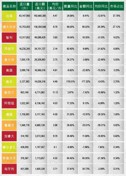 从进口来源地方面看,大部分主要进口来源地保持量额齐升。自澳大利亚进口的持续的增长仍为市场回暖最强劲的发动机,且其增幅继续提高,对第三名的智利则几乎形成了3:1的优势,同时排名第一的法国的进口额增速出现了小幅下降,两相作用下,澳大利亚同法国的市场占比差距缩小了不到11个百分点;智利的进口额增长出现加速,同西班牙的差距又有所拉大。意大利的跌幅继续收窄,但仍为前5名中唯一一个进口额负增长的来源地。其后的南非和美国交换了位次。