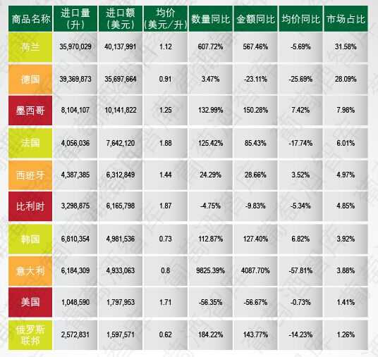 进口来源地方面,荷兰仍占据榜首的位置,但和排名第二的德国之间的差距在减小。墨西哥继续占据第三的位置。排名6、7的韩国和比利时交换了名次,其余来源地名次无变化。