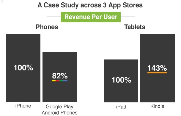 游戏开发公司TinyCo一份最新的研究报告显示,Amazon App Store为开发者创造的每用户平均收入(ARPU,average revenue per paying user)正赶超苹果的iTunes商店,而且是Google Play的两倍之多。 该公司最近分别对iOS、Google Play(Android)和Amazon应用市场的上的游戏Tiny Village产生的收入进行了数据跟踪和统计。结果显示,Amazon商店(仅Kindle Fire可用)上每用户平均收入要多于iTunes上单个用户创造的收入,且两者都比Google Play赚的多。 TinyCo公司的业务拓展总监Jennifer Lu称,这种情况不是他们一家遇到,绝大部分开发者都面临着这种情况。Lu还说:“我们80%-90%的时间和资源都放在了iOS开发维护上,仅分给Android版很少一部分。而且游戏在iOS平台上表现非常好,但在Android平台上就表现很烂,而且Android版也缺少很多iOS版上的功能。另外,如果要想让Android版和iOS版有同样的质量和体验的话,这需要公司付出更多的时间来提高Android上不同设备上表现,这显然是不可取的。”