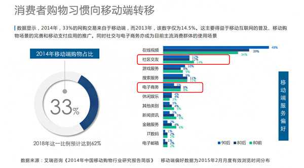 • 数据显示,2014年中国移动购物市场规模达9297.1亿元,占网购交易总额的33%,较2013年增幅超过200%;