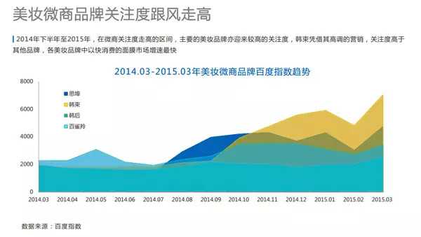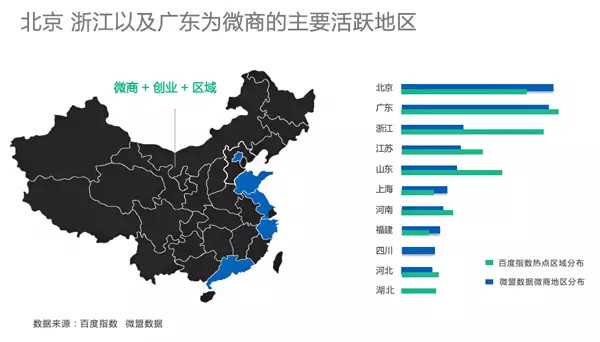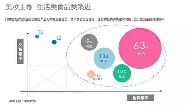 2015年,全民关注微商,北京,浙江及广东成为微商的主要发展地区,高频购买的低价产品成为微商主要品类,其中,美妆类占据主导地位,生活类以及食品类跟进。