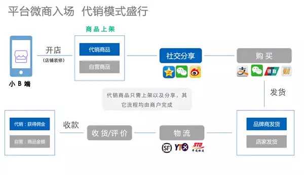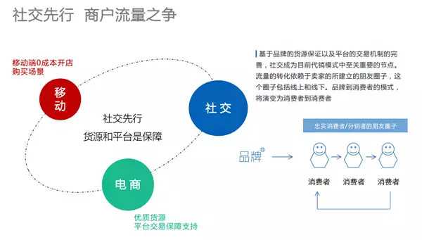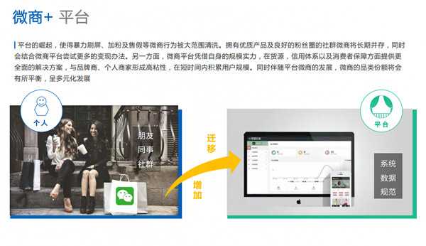 平台微商凭借自身的规模实力,在货源,信用体系以及消费者保障方面提供了更为全面的解决方案,与品牌商及个人商家形成高粘性,前期快速形成规模用户积累,而伴随着平台微商的发展,微商的品类份额将会有所平衡;