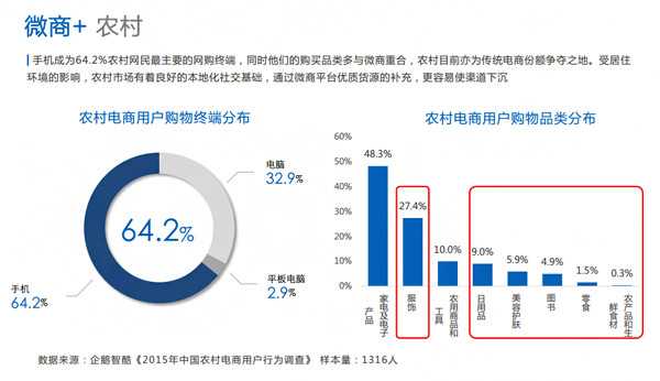 •64.2%的农村网民通过手机购物,同时受居住环境影响,农村有着良好的本地化社交基础,通过微商平台优质货源 的补充,更容易做到渠道下沉。
