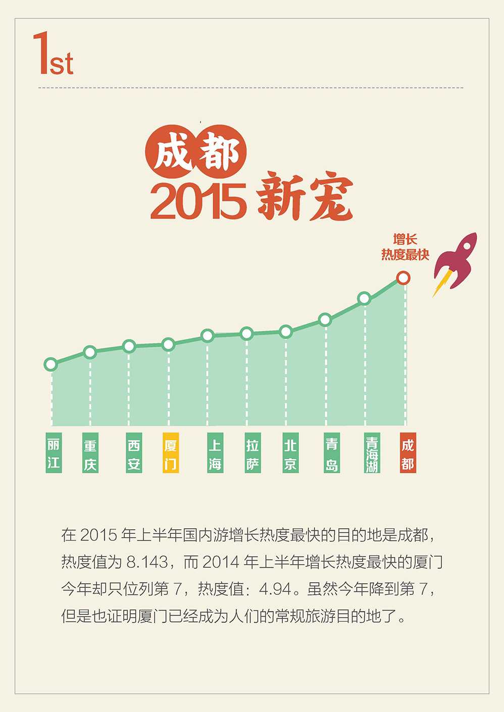 2015 年上半年增长热度最快的自由行目的地是成都,蚂蜂窝热度值为8.14。难怪发布“世界那么大,我想去看看”的顾老师把她出行的第一站也放在了成都。另外,2014 年上半年增长热度最快的厦门仅位列第 7,热度值为4.94。这说明厦门在自由行用户心中已成为常规的旅游目的地。