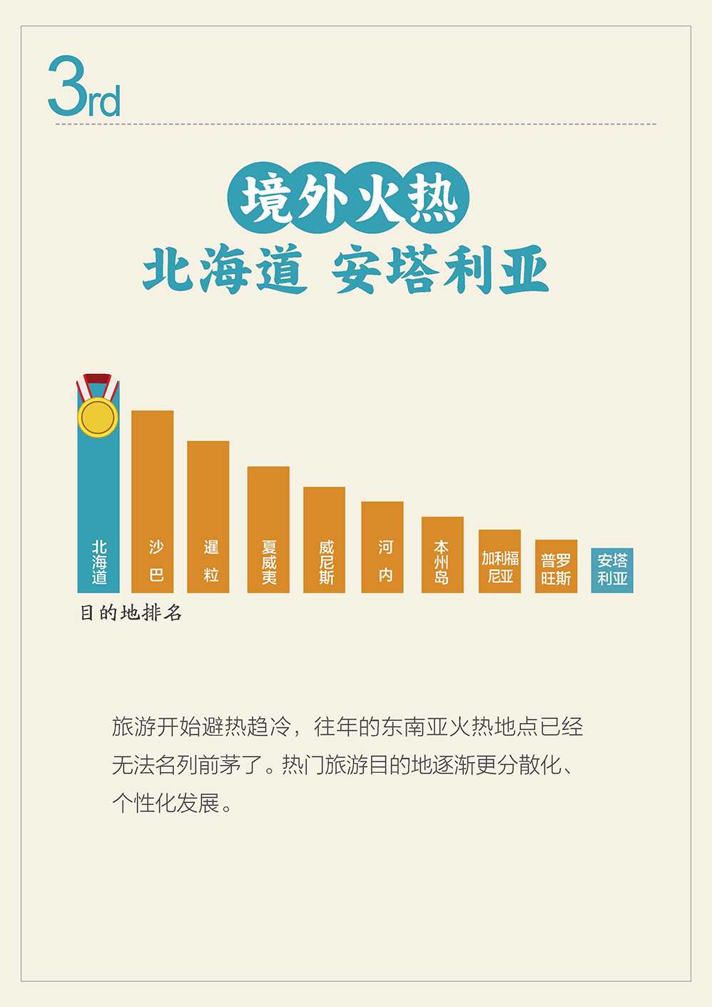 自由行热度增长最快的10大境外目的地分别是:北海道、沙巴、暹粒、夏威夷、威尼斯、河内、本州岛、加利福尼亚、普罗旺斯、安塔利亚。这说明人们旅游开始注意避热趋冷,热门旅游目的地呈现分散化、个性化的趋势。