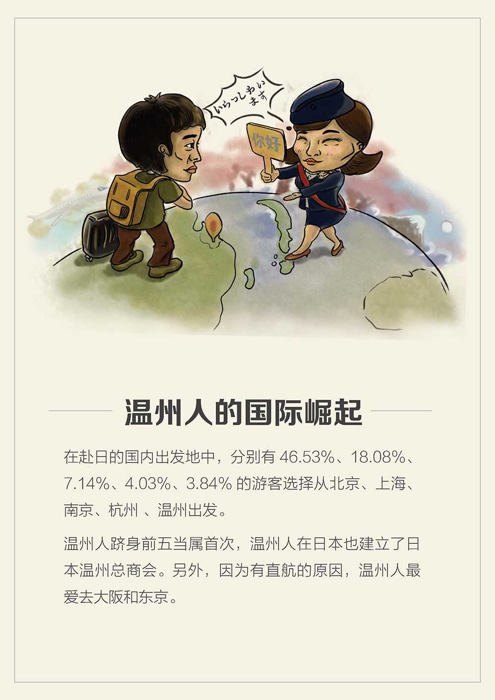 在赴日的国内出发地中,分别有46.53%、18.08%、7.14%、4.03%、3.84% 的游客选择从北京、上海、南京、杭州 、温州出发。温州人跻身前五当属首次,温州人在日本也建立了日本温州总商会。另外,因为有直航的原因,温州人最爱去大阪和东京。