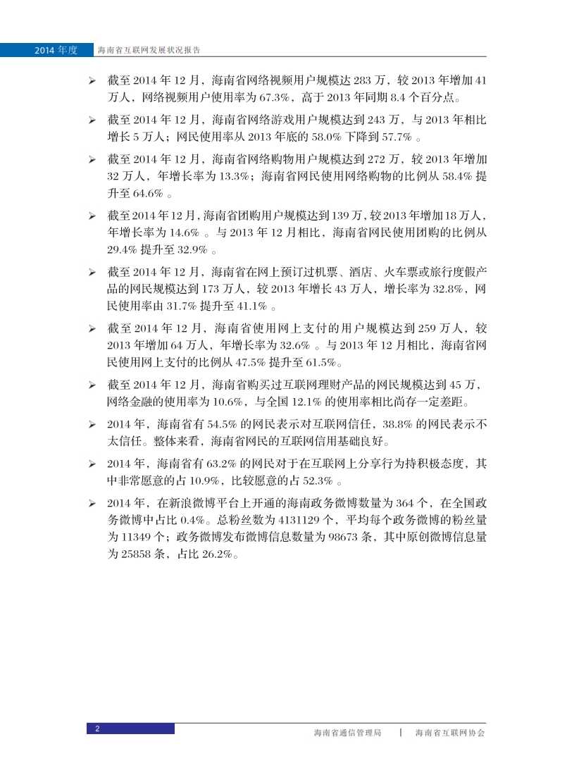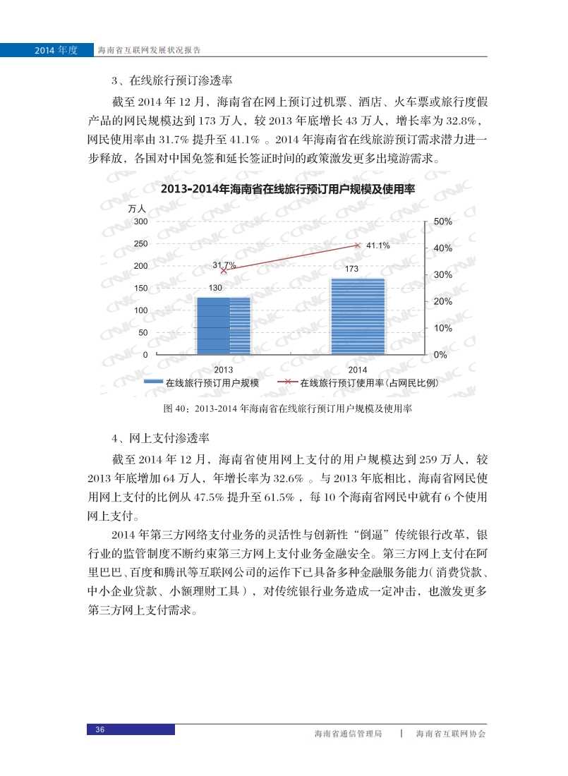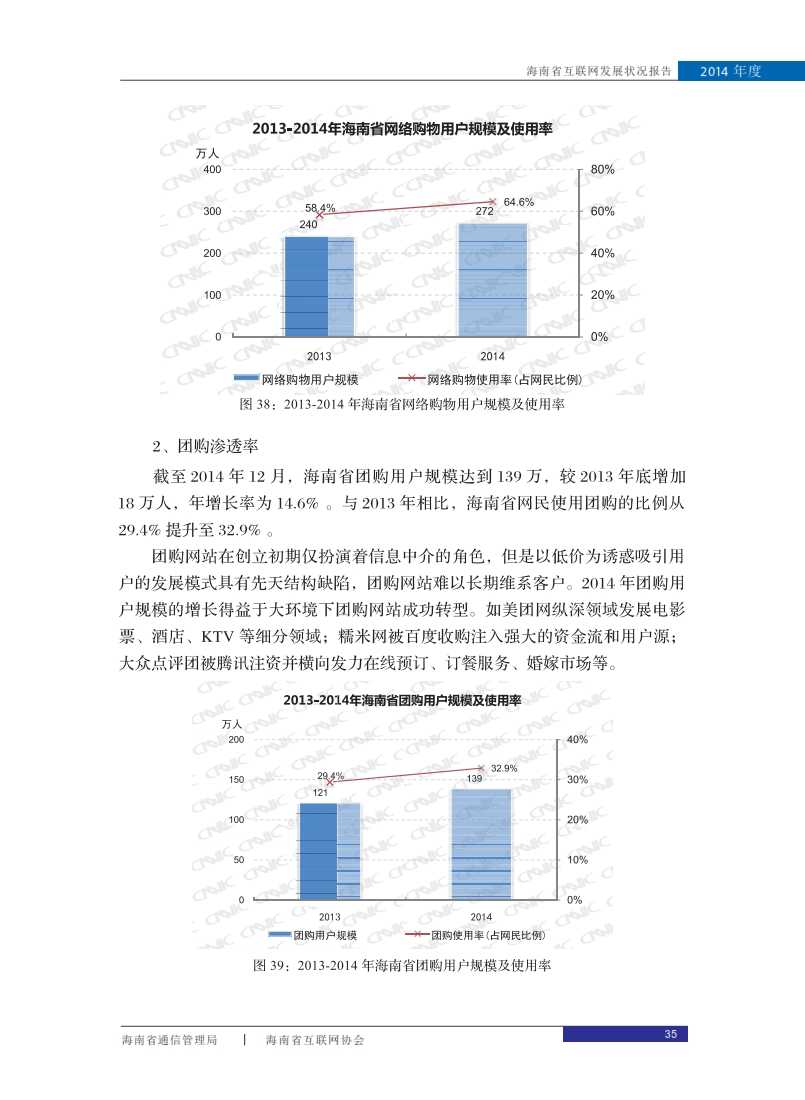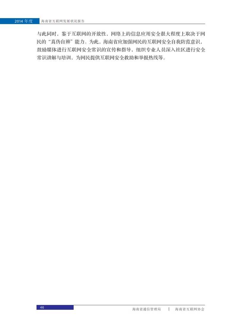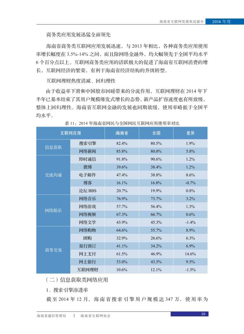 2014年,海南省商务类互联网应用发展迅速,与2013年相比,各类商务类应用使用率增长幅度在3.5%-14%之间,而且除互联网理财外,均大幅领先于全国平均水平6个百分点以上。其中,网上支付使用率领先全国平均水平14.6个百分点,网上银行和网络购物使用率分别领先全国平均水平9.5和 8.9个百分点。互联网商务类应用的活跃极大的促进了海南省互联网的消费的增长,互联网经济的繁荣,有利于海南省经济结构的升级转型。