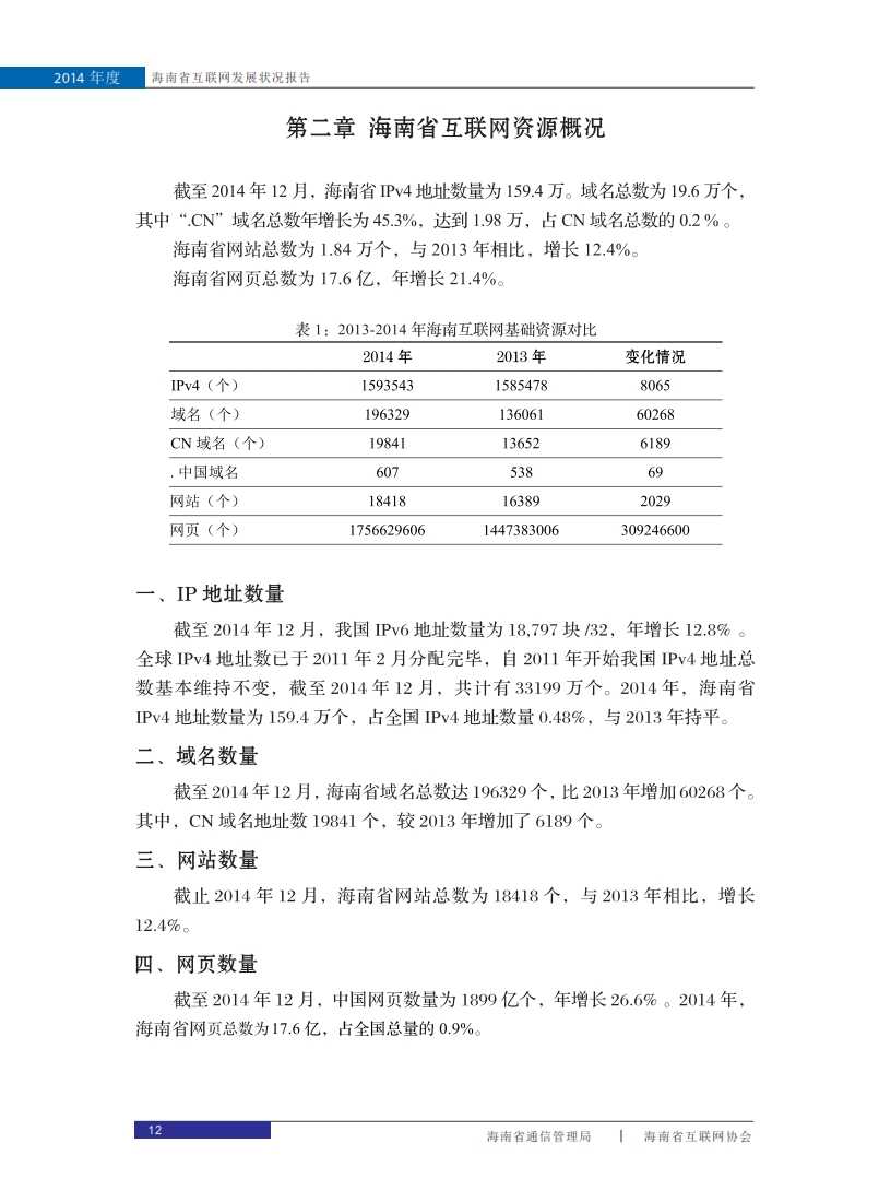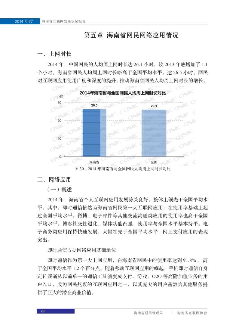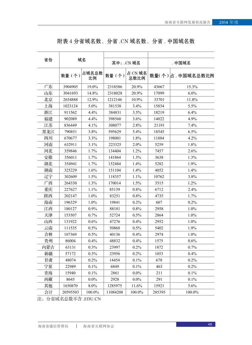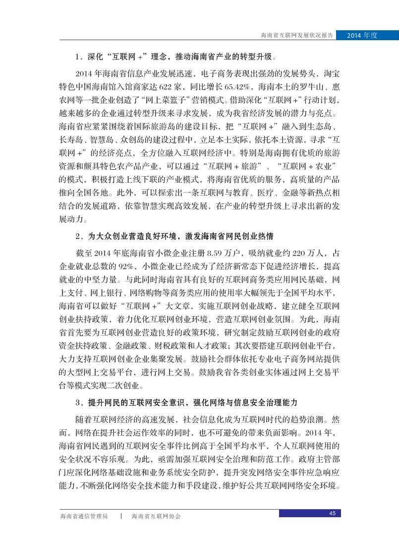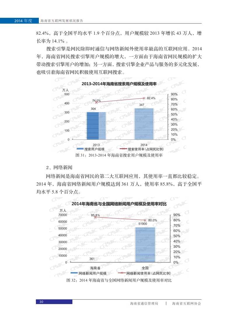 2014年,海南省商务类互联网应用发展迅速,与2013年相比,各类商务类应用使用率增长幅度在3.5%-14%之间,而且除互联网理财外,均大幅领先于全国平均水平6个百分点以上。其中,网上支付使用率领先全国平均水平14.6个百分点,网上银行和网络购物使用率分别领先全国平均水平9.5和 8.9个百分点。互联网商务类应用的活跃极大的促进了海南省互联网的消费的增长,互联网经济的繁荣,有利于海南省经济结构的升级转型。