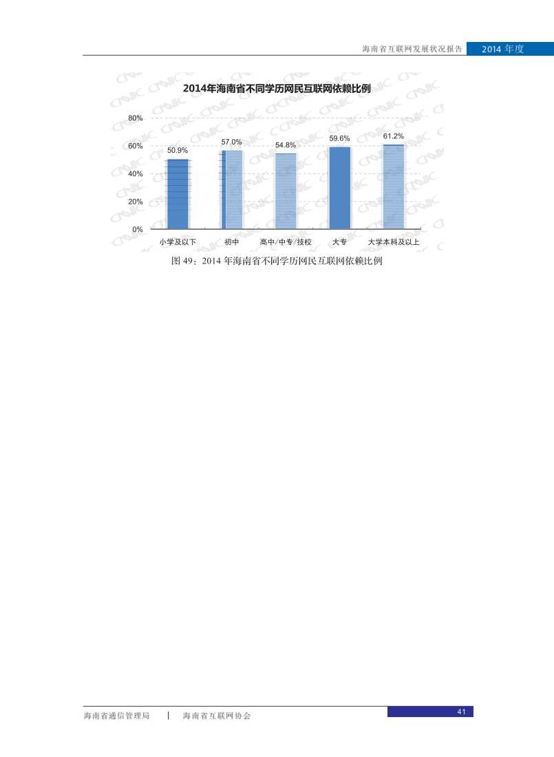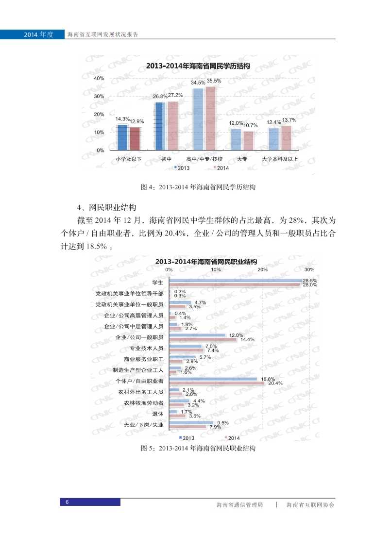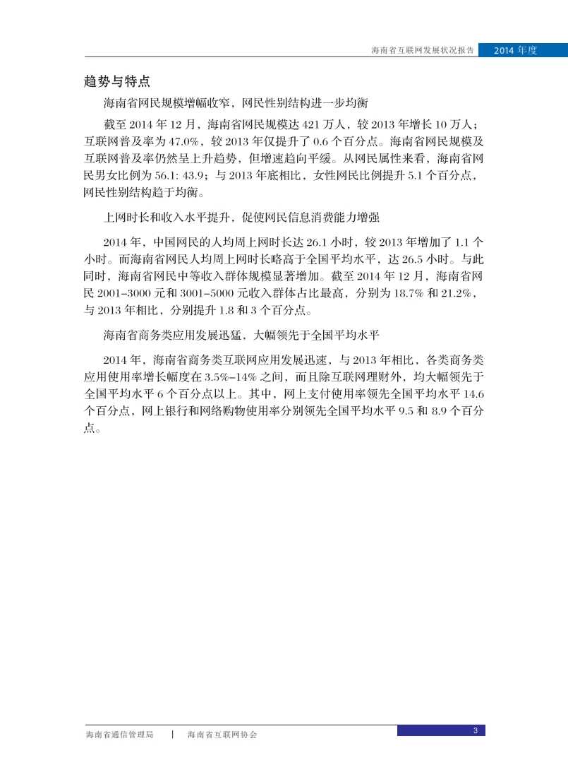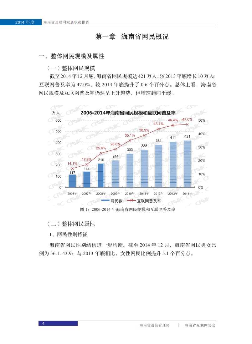 截至2014年12月底,海南省网民规模达421万人,较2013年底增长10万人;互联网普及率为47.0%,较2012年底仅提升了0.6个百分点。海南省网民规模及互联网普及率仍然呈上升趋势,但增速趋向平缓。从网民属性来看,海南省网民男女比例为56.1: 43.9;与2013年底相比,女性网民比例提升5.1个百分点,网民性别结构趋于均衡。