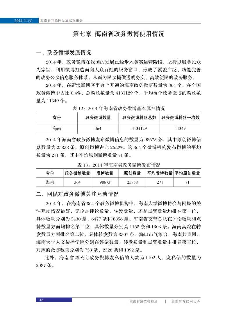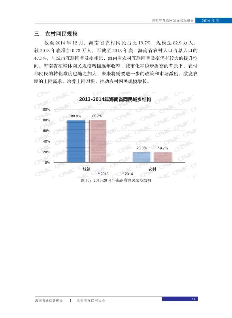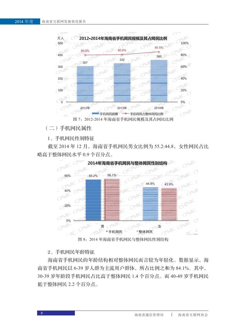 海南省手机网民的增速超过海南省整体网民。截至2014年12月,海南省手机网民规模达360万,较2013年底增加28万人,而2014年海南省整体网民增长10万人。海南省网民中使用手机上网的人群占比由2013年的80.8%提升至85.5% 。