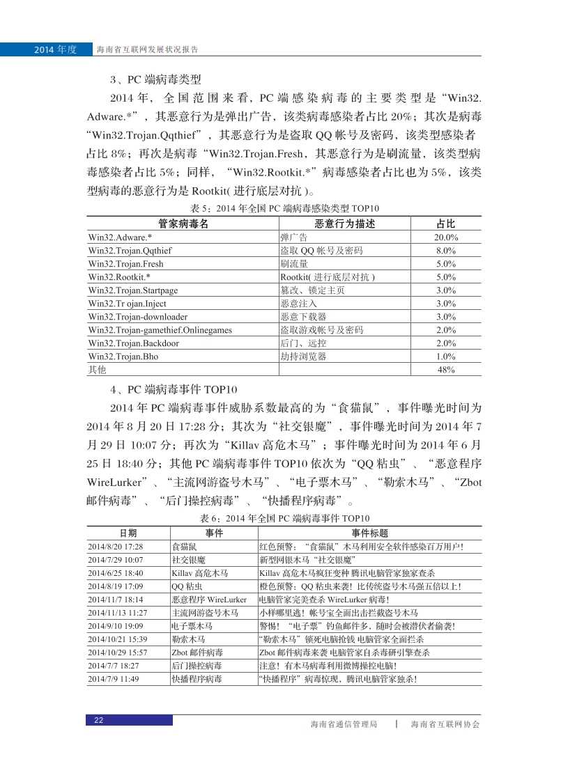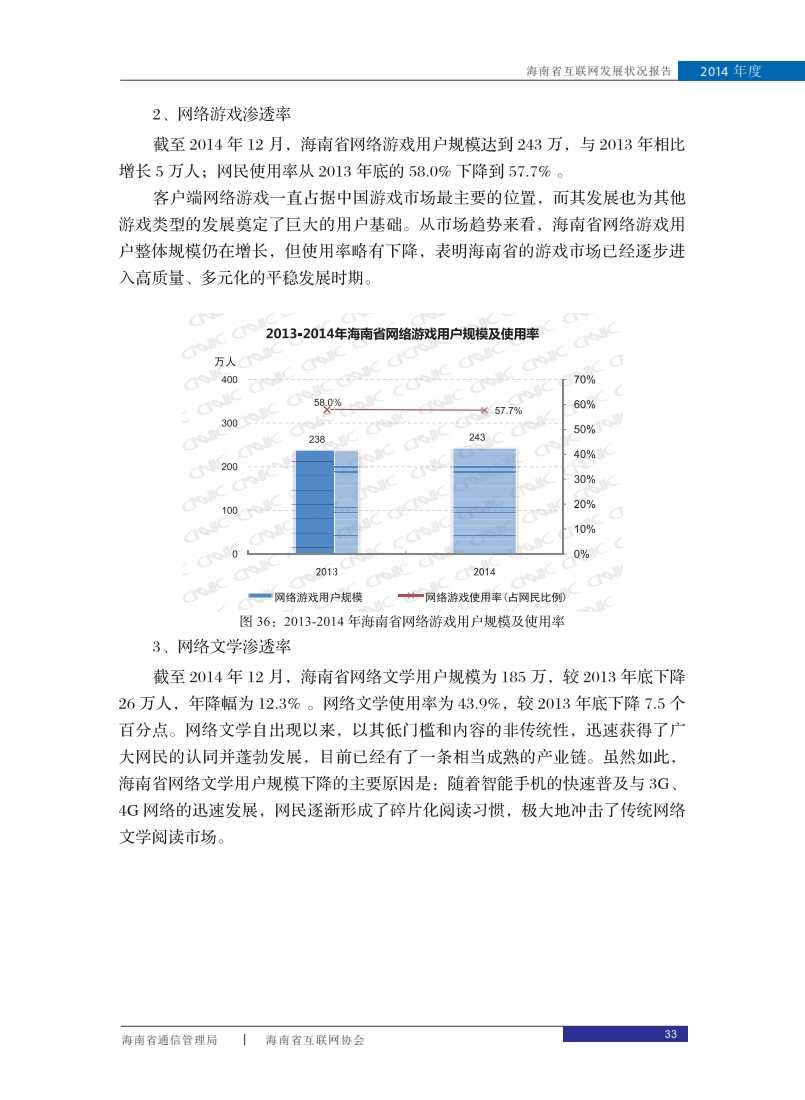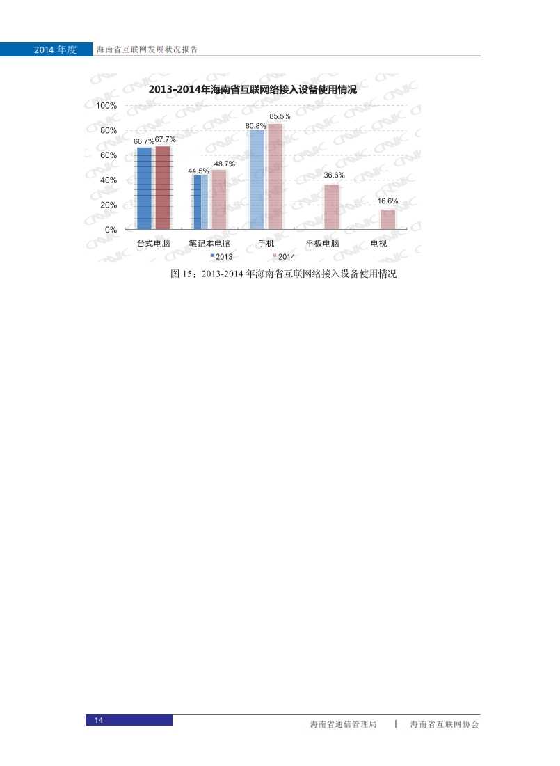 2014年,海南省网民通过台式电脑接入互联网的比例为67.7%,与2013年底基本持平;通过笔记本电脑和手机接入互联网的比例继续增高,达到48.7%和85.5%,较2013年底分别提高4.2和4.7个百分点;平板电脑的娱乐性和便捷性特点使其成为网民的重要娱乐设备,2014年底使用率达到36.6%,高出全国平均水平(34.8%)1.8个百分点。
