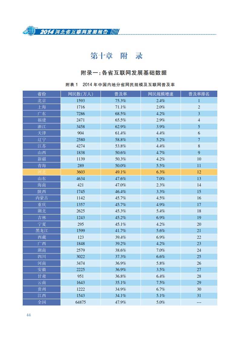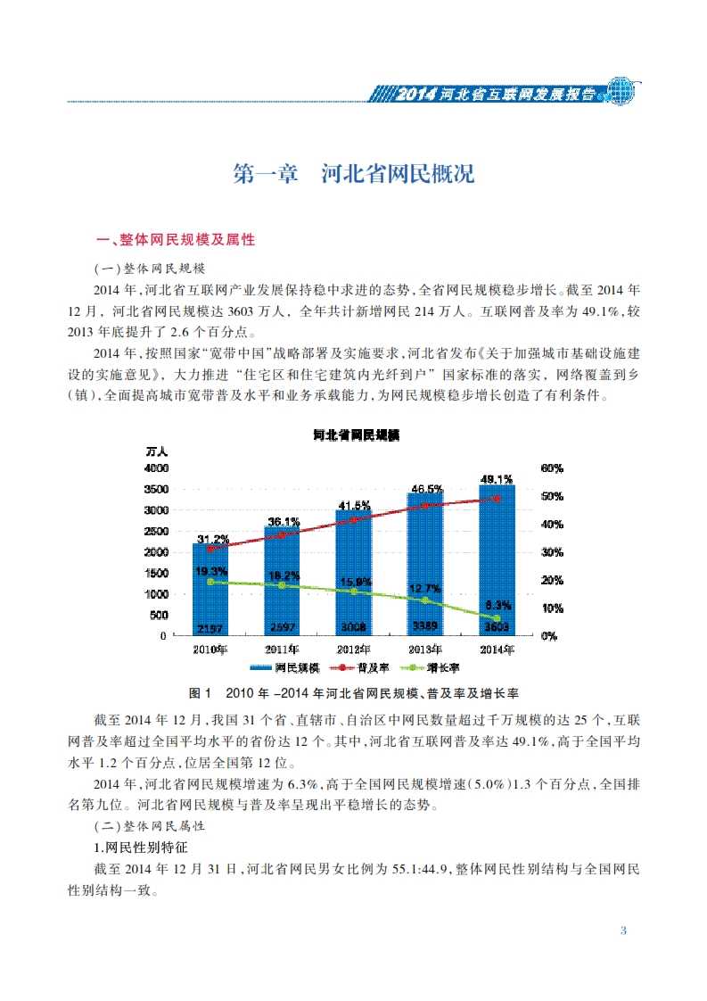 2014年,河北省互联网产业发展保持稳中求进的态势,全省网民规模稳步增长。截至2014年12月,河北省网民规模达3603万人,全年共计新增网民214万人。互联网普及率为49.1%,较2013年底提升了2.6个百分点。