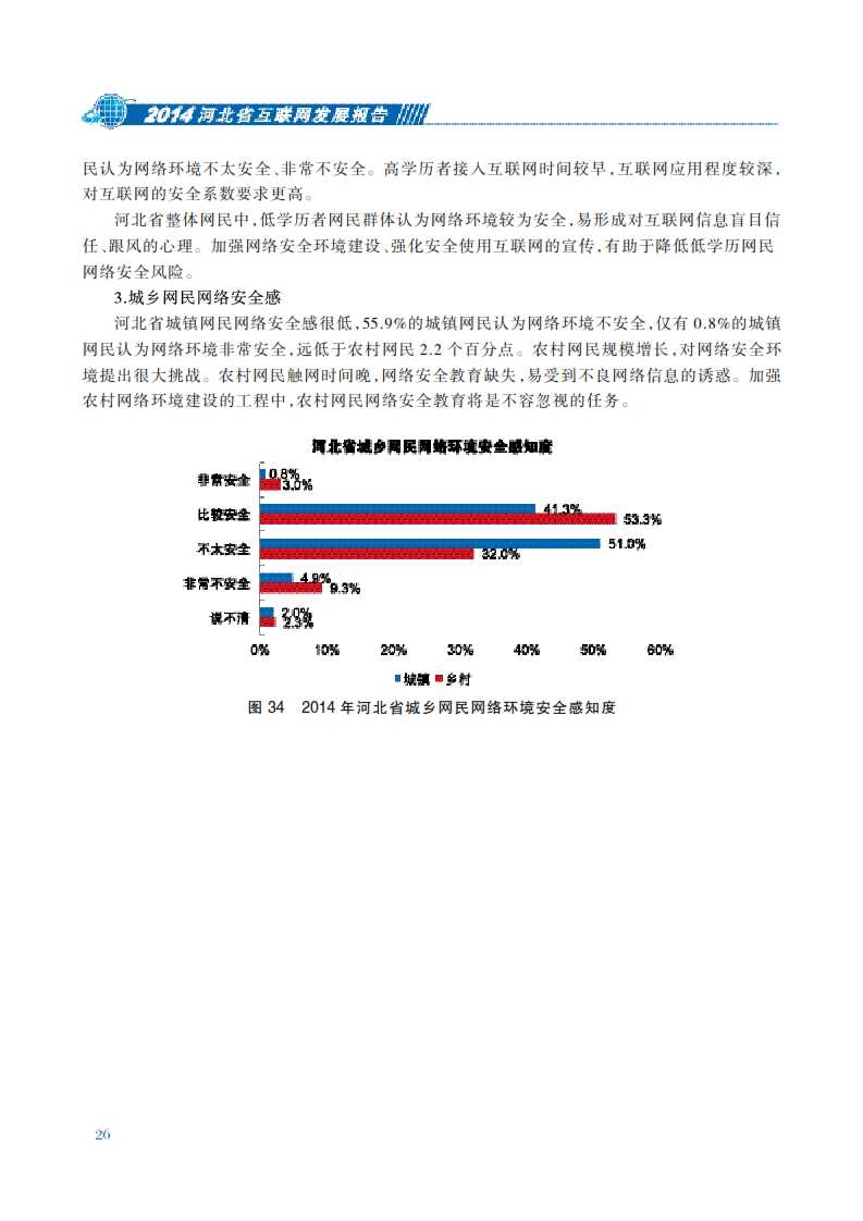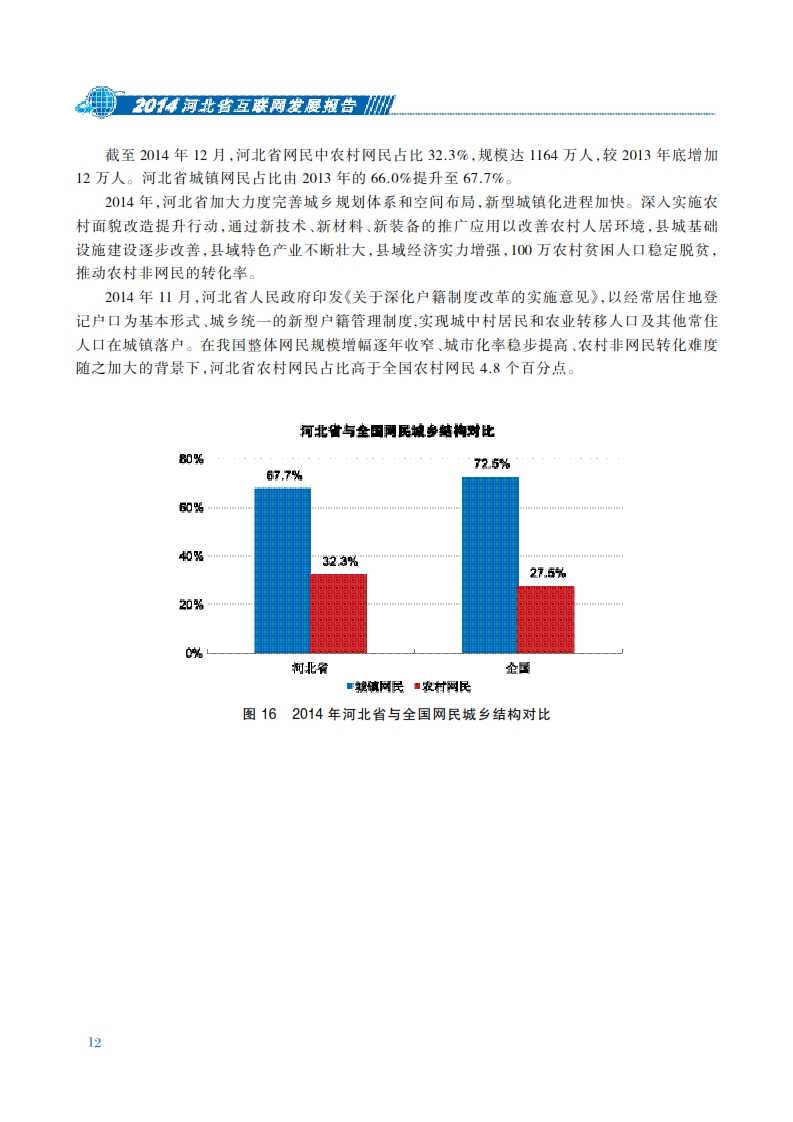 截至2014年12月,河北省网民中农村网民占比32.3%,规模达1164万人,较2013年底增加12万人。河北省城镇网民占比由2013年的66.0%提升至67.7%。在我国整体网民规模增幅逐年收窄、城市化率稳步提高、农村非网民转化难度随之加大的背景下,河北省农村网民占比高于全国农村网民4.8个百分点。