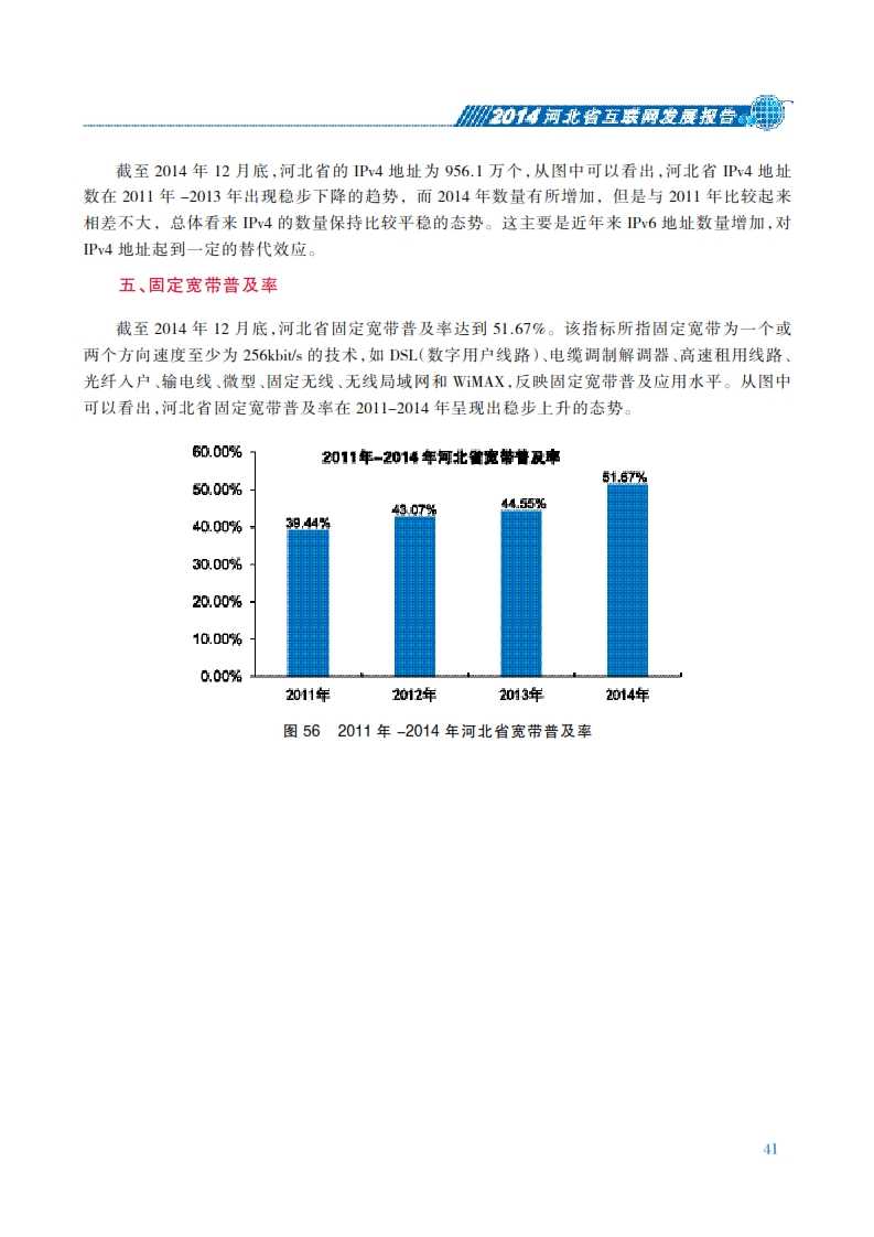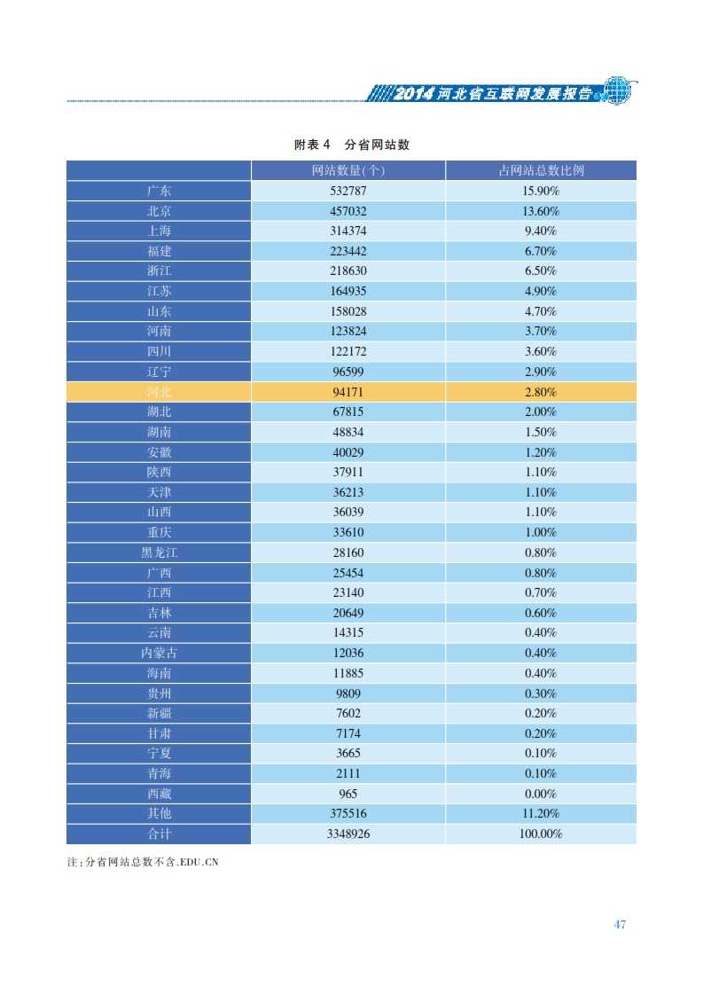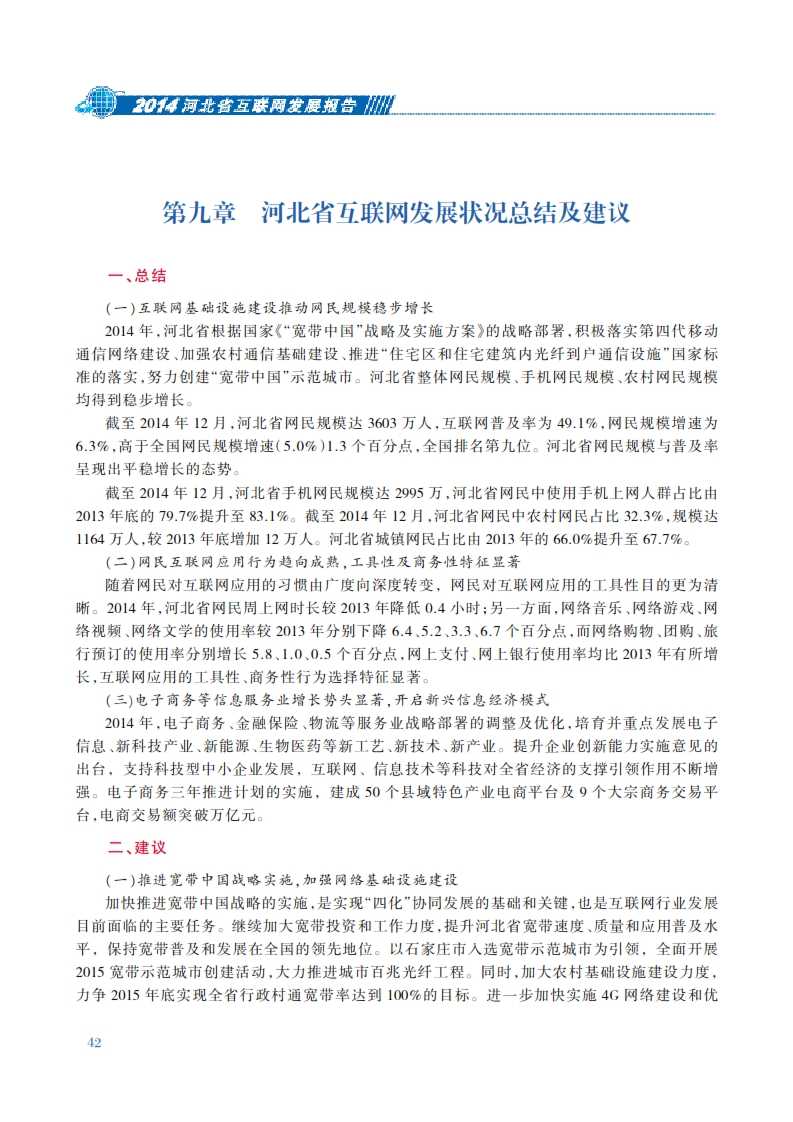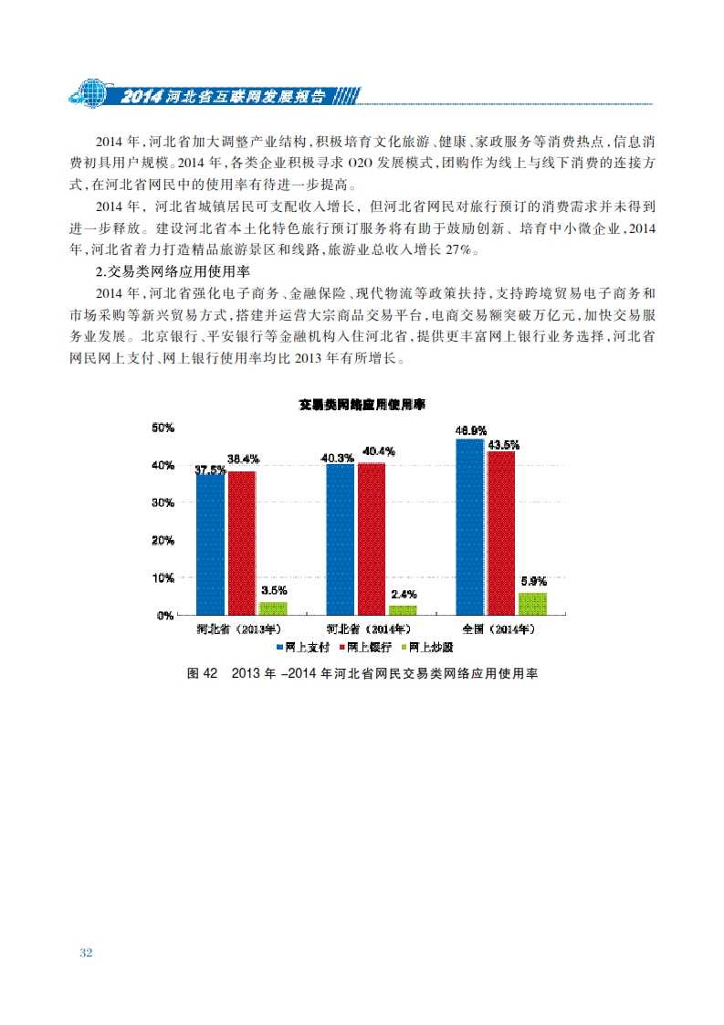 2014年,河北省强化电子商务、金融保险、现代物流等顶层战略部署及实施,服务业发展优势显著。着力实施电子商务三年推进计划,建成50个县域特色产业电商平台,电商交易额突破万亿元,在一定程度上促进网络购物、团购、旅行预订、网上支付、网上银行等商务交易类互联网应用使用率的提升。