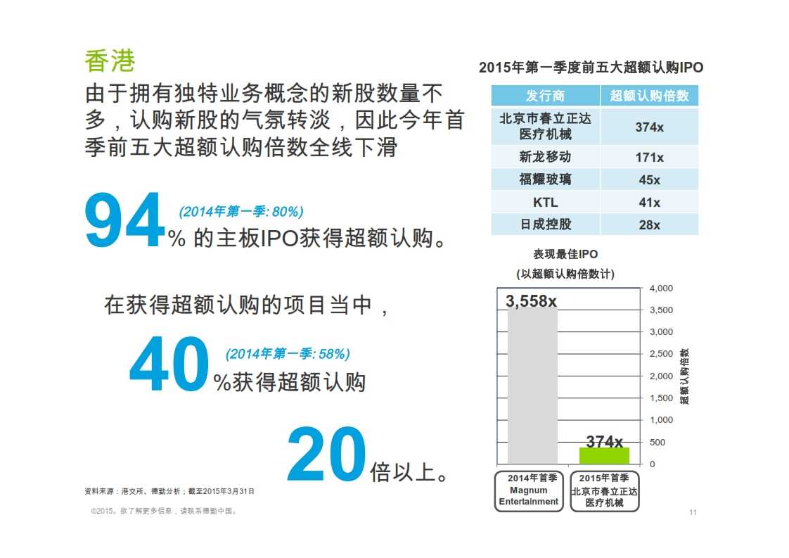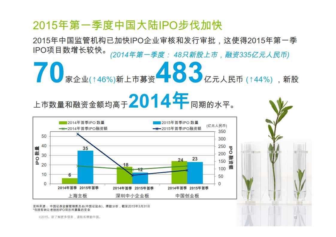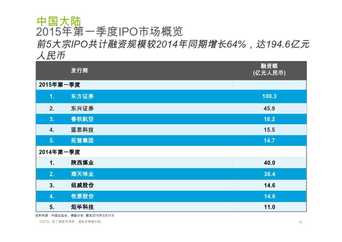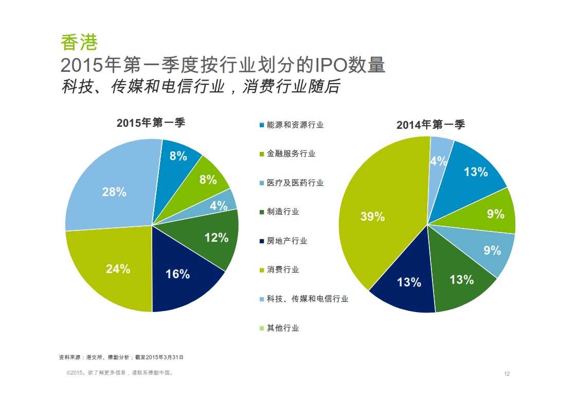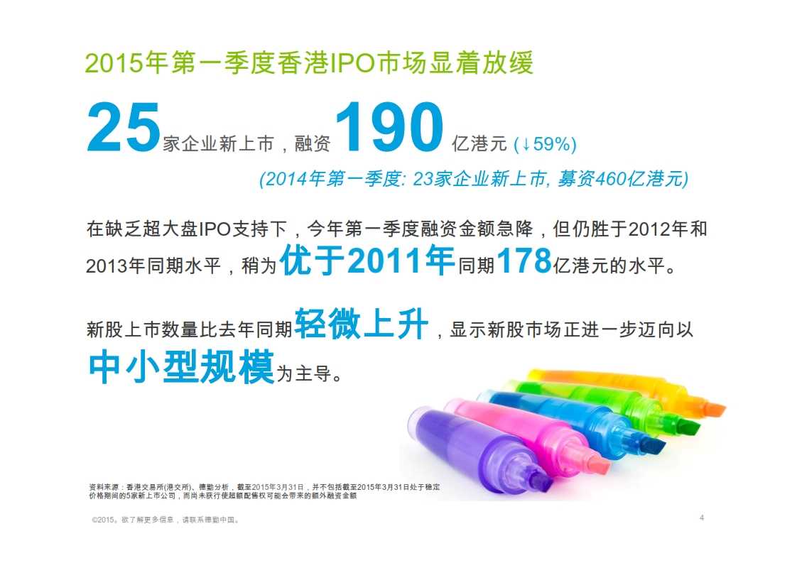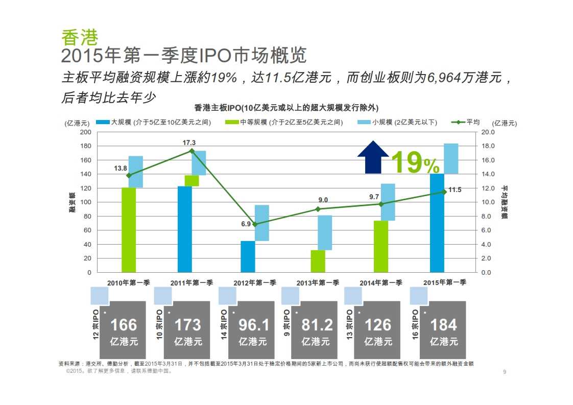 德勤中国全国上巿业务组就香港和中国大陆新股巿场的最新分析显示,2015年首3个月,香港新股巿场以较缓慢的步伐开始,期间并没有完成超大型新股项目,总共有25只新股上巿融资190亿港元。新股融资额由2014年第一季的460亿港元下降59%,但仍然超越2012年和2013年同期的融资金额。