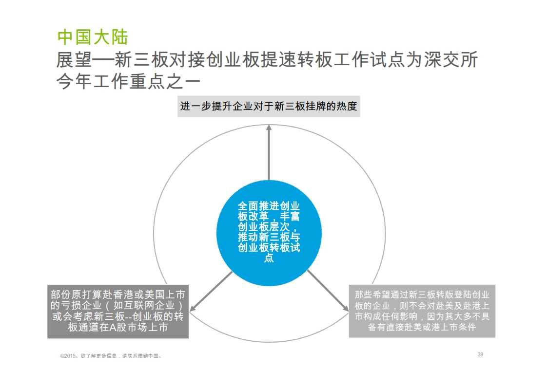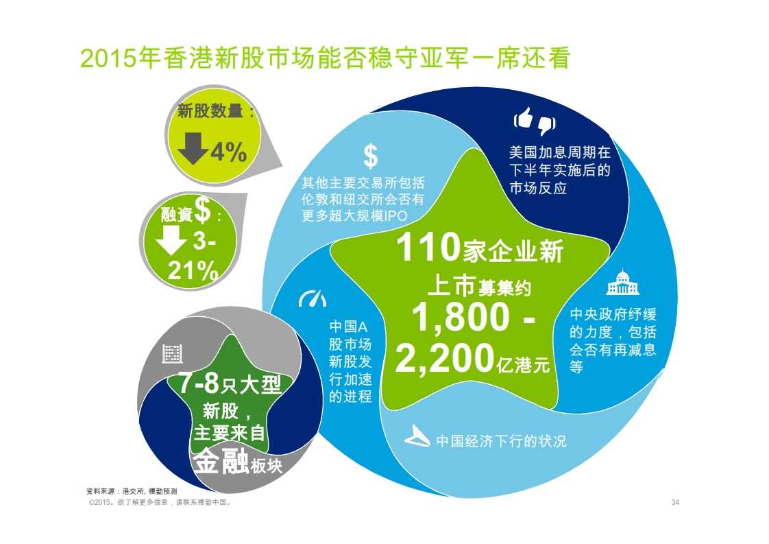 德勤预测来自中国金融业的7至8只大型新股,以及目前筹备上巿的项目,会有助香港今年能完成110只新股上巿,融资额达1,800-2,200亿港元。利率巿场化、互联网金融崛起、中资证券行提升服务的计划、优化沪港股票市场交易互联互通机制(沪港通) ,以及巿场期待推出深港通将会推动大型上巿项目。
