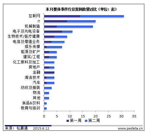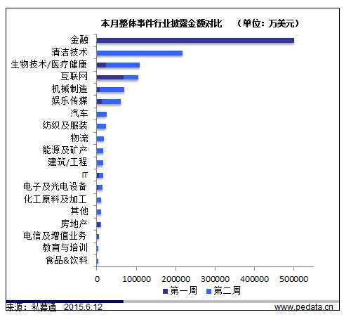 【清科点评】本周投资市场天气晴,截止到本周五下午,共发生35起投资事件,披露投资金额事件29起,共4.83亿美元,平均投资金额为1664.36万美元,较上周的平均投资金额2725.60万美元环比下降38.9%。其中TMT行业有22起投资事件。本周涉及金额最大的投资事件为:6月9日消息,美国华平投资集团、高瓴资本管理有限公司、渣打直接投资有限公司和红杉资本中国基金联合投资中通速递服务有限公司10.00亿元人民币。在圆通速递宣布获阿里巴巴联手云峰基金的战略投资不久之后,中通内部邮件宣称获数十亿元融资。2014年中国的快递量已经是全球第一,并且继续以高速度增长,其中电商件的比重达到六七成甚至更高,急剧的增长速度带来的庞大市场即将引发一场剧烈争夺战,洗牌大幕已被资本的介入快速拉开。