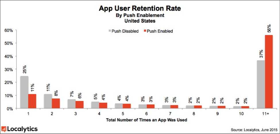 在接收推送讯息的北美用户中,50%经常返回应用。