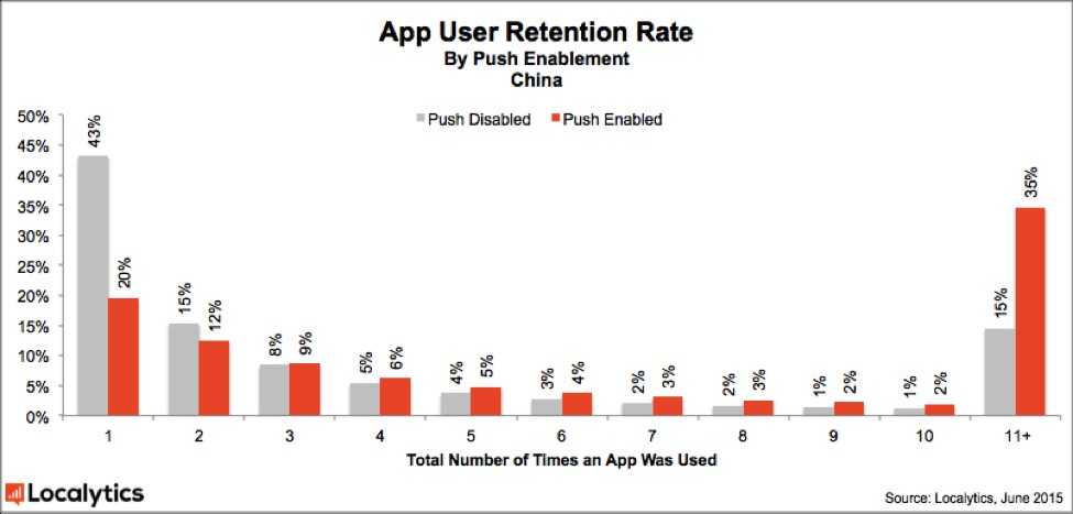 在中国,利用推动讯息的应用也有更高的保留率。应用放弃率也下降至20%,保留率则上升至35%。
