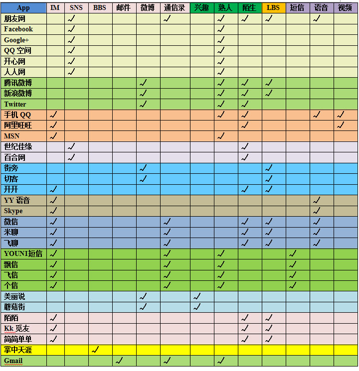 1、 社交方式:分为移动IM、微博、SNS、邮件、通信录、BBS、LBS