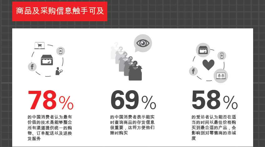 中国消费者需要商品信息的可视化:78%的受访者认为购物体验中最重要的就是能整合所有渠道提供统一的购物与配送服务;而69%的中国受访者表示能实时查询商品的存货信息很重要,这将方便他们随时购买。