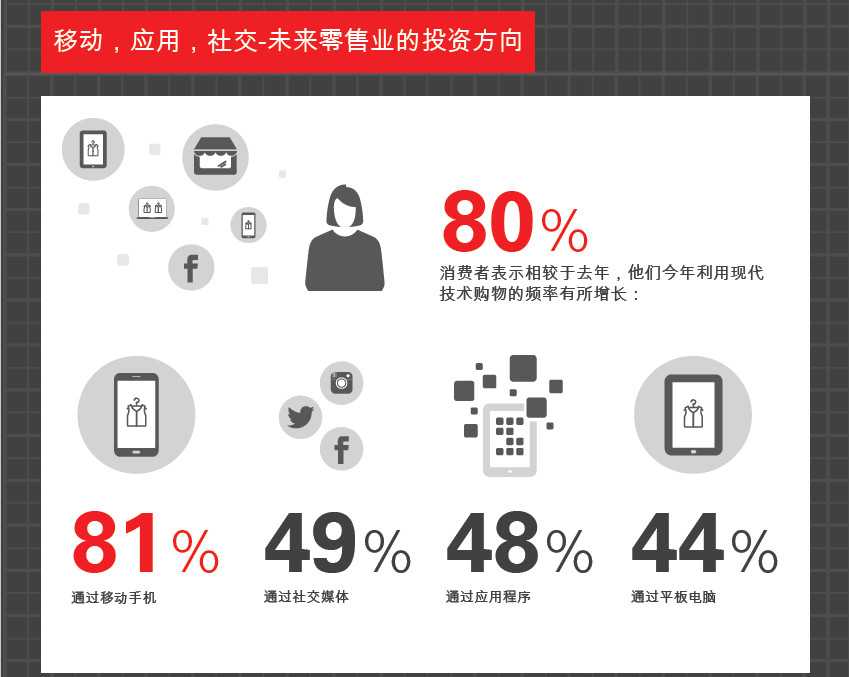 中国消费者表示全渠道体验至关重要:95%的受访者希望零售商对先进技术进行投资;78%的受访者表示全渠道体验是提升购物体验的关键;80%的受访者提到自己去年在购物的过程中更多地使用了新技术,最主要的是移动设备(81%的受访者)和社交媒体(49%的受访者)。