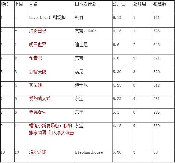 - 上月入围第六十八届戛纳国际电影节主竞赛单元、由是枝裕和执导的《海街日记》,上周末在日本正式公映,首映不敌本土动画《Love Live! 剧场版》,仅获得第二位。