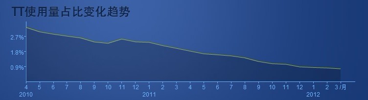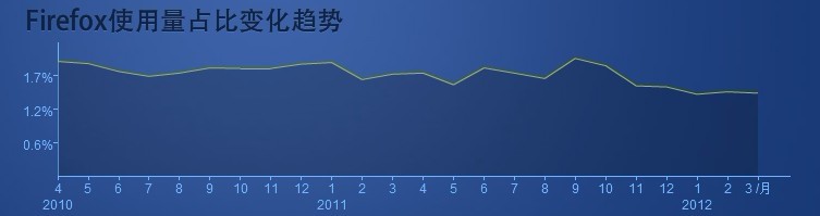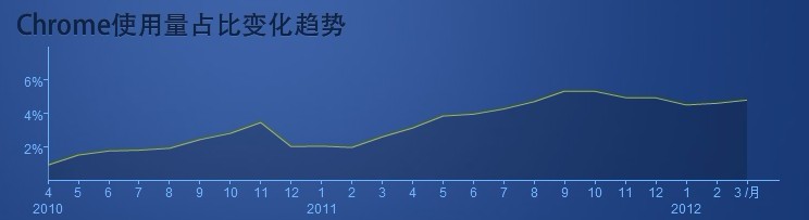 Chrome从2010年初到2011年Q3保持了良好的上升趋势,流量份额一度达到了5.33%。而2011年Q4到2012年Q1又略有回落。Chrome想要在国内取得长足进步还有待时日。