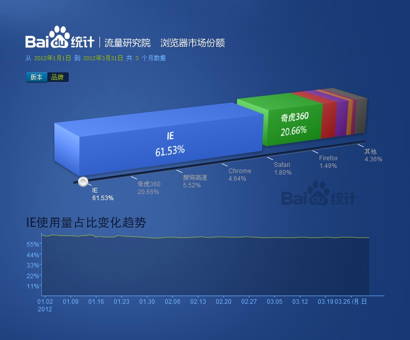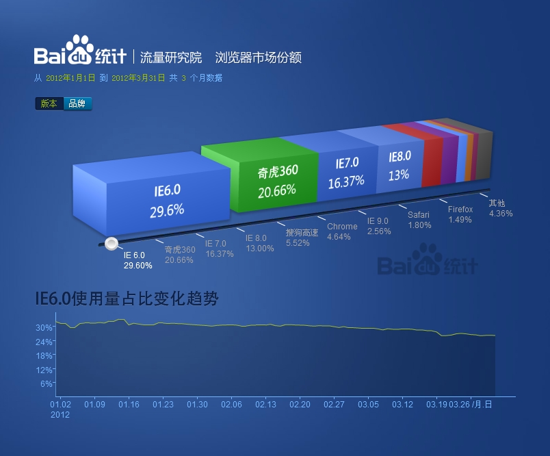 根据百度统计流量研究院的数据分析,国内浏览器市场上位列三甲的分别是IE6.0,奇虎360,IE7.0。三个版本的浏览器流量份额占到了总份额的66.6%左右。