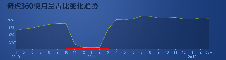 奇虎360浏览器的流量份额变化趋势中,最让人印象深刻的无疑是2010年10月-2010年2月的猛然骤降——这便是互联网历史上著名的“3Q大战”。腾讯和360从2010年9月底的专题对喷,发展至10月的弹窗大战,继而演变成“二选一”,双方斗争的激烈程度超乎想象。