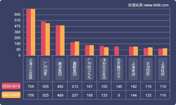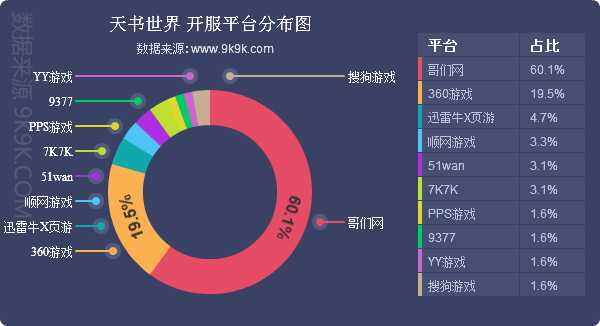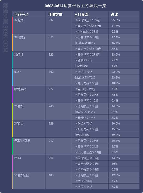哥们网本周继续加强《天书世界》的推广力度,开服总量较上周增加了7%;另外哥们网本周新引进了《莽荒纪》、《西游伏魔》两款游戏,发展潜力较大。 9377本周开服总数保持稳定,其主打游戏《雷霆之怒》的开服频率稳定在10服/天,开服占比较上周增加4.2%,目前与《烈焰》保持一致。