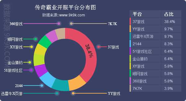 点评:《传奇霸业》本周表现稳定,开服总数变化不大,其在YY游戏、迅雷牛X页游的开服频率本周均稳定于5服/天,开服占比均为9.7%;本周新增分布占比平台7K7K。