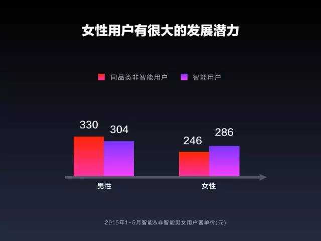不管是智能用户还是同品类非智能用户,整体情况是男性用户的客单价都要高于女性用户。如果单看女性用户这边的情况,智能用户的客单价要比同品类非智能用户的客单价要高。也就是说,女性用户在智能产品消费方面有很大的发展潜力。