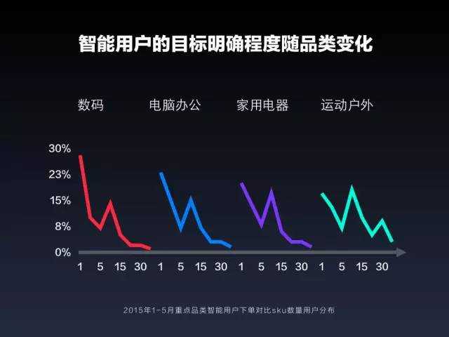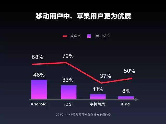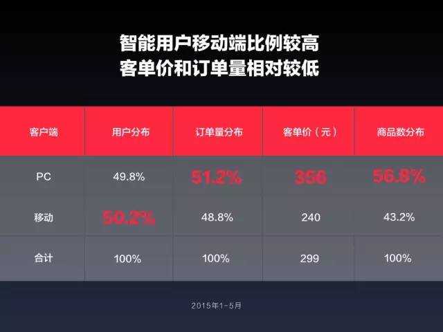 智能用户通过移动端交易的比例较高,达到50.2%。不过从订单分布量、客单价、商品数分布这三个环节里面,我们发现PC端交易会更猛一些。