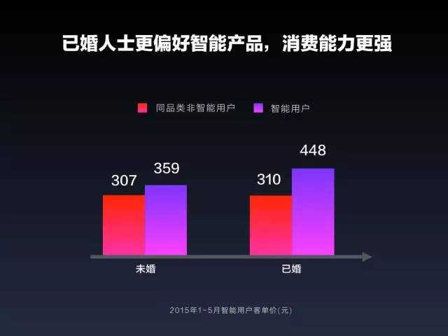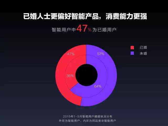 在智能用户里面,47%是已婚用户。相比同品类非智能用户,已婚用户的比例仅为36%。