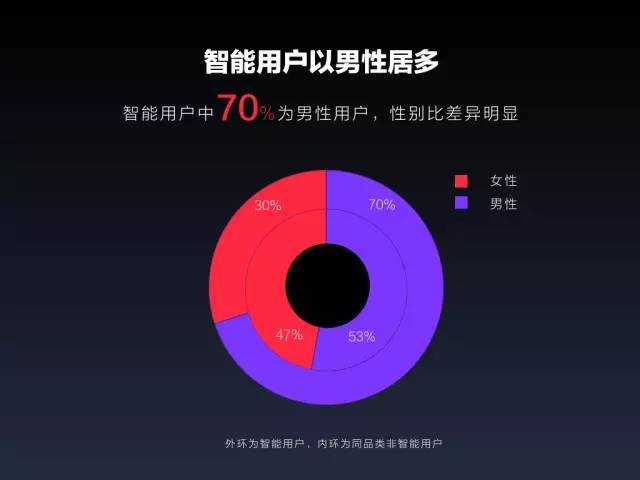 在智能用户里,70%为男性用户,男女比例差异明显。而在同品类非智能用户里面,这个差异相对要小一些,男性用户仅占53%。