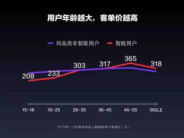 从消费力来看,不管是智能用户还是同品类非智能用户,用户年龄越大,客单价越高。刚才我们提到,26岁到35岁是智能用户的主体,他们的客单价大概是303元。