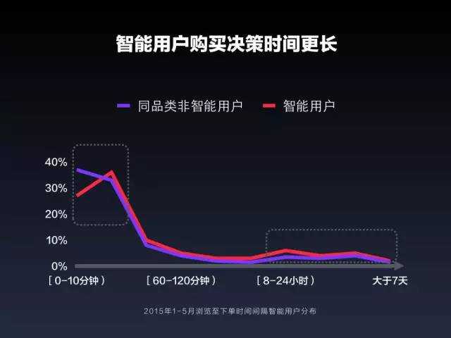 相比同品类非智能用户,智能用户的购买决策时间更长。如果决策时间控制在30分钟以内的话,智能用户的下单比例要小于同品类非智能用户。