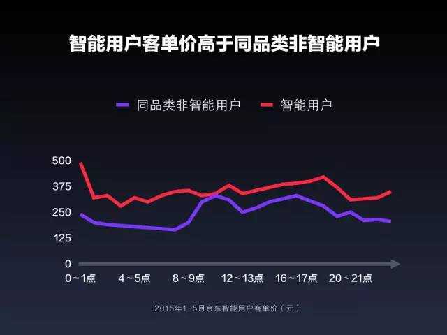 按一天24小时来划分的话,智能用户的客单价一直高于同品类非智能用户的客单价。