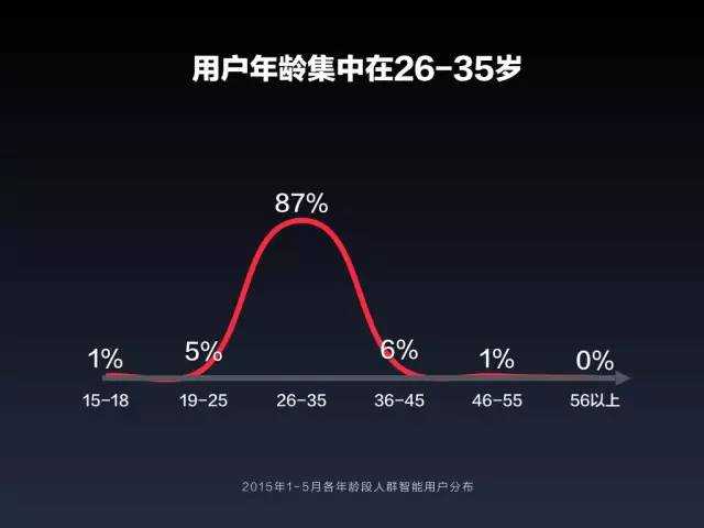 从年龄分布来看,约87%的智能用户的年龄段停留在26岁到35岁之间,18岁以下和46岁以上的智能用户分别仅占1%左右。