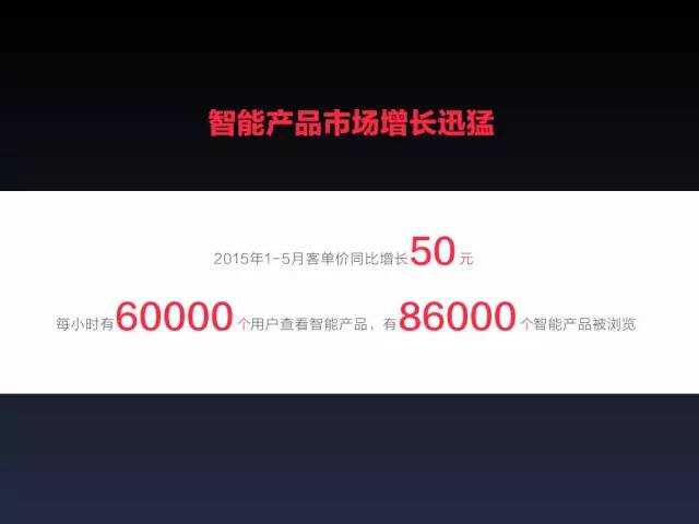 在上半年里,京东平台上每个小时有6万用户查询智能产品,共计8万6千个智能产品的相关页面被浏览。从交易来看,2015年上半年的客单价同比增长50元。