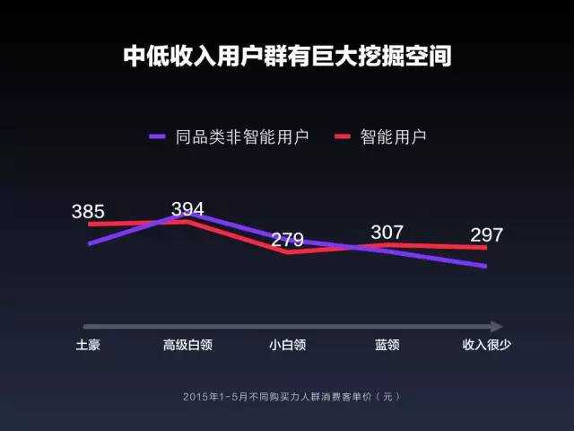 不管是智能用户还是同品类非智能用户,主力消费人群的购买力都很强。其中智能用户里面,高收入人群占了50%左右。