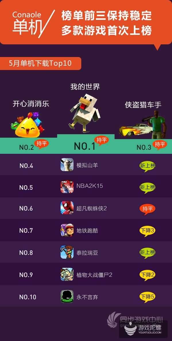 同步游戏中心正式发布2015年5月份平台数据报告,报告公布了同步游戏中心2015年05月份接入新品情况、单机和网游下载及收入Top10榜单。