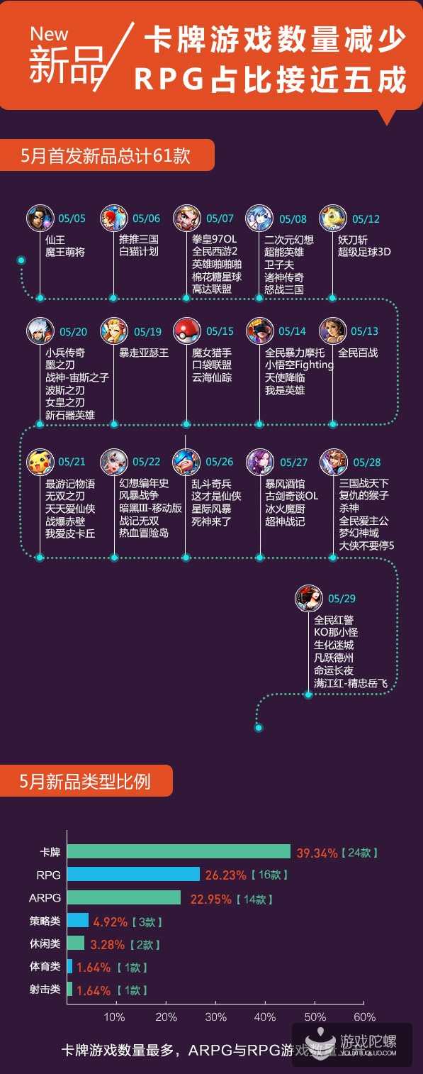 同步游戏中心2015年5月总计首发新品网游61款,其中卡牌游戏24款,占比39.34%;ARPG与RPG共30款,占比49.18%,首发RPG与APRG游戏5月占比接近五成,数量上首次超过卡牌新游。本月重度游戏数量较多,策略,休闲,体育,射击等类型游戏各占了一定比例。