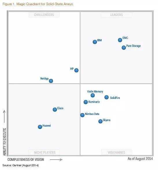EMC包括XtremIO和VNX-F。XtremIO去年从2.4到3.0的升级需要停机引起很多客户不满,但EMC销量能力强大,销量收入遥遥领先。但XtremIO不能提供基于LUN的数据缩减报告,可用性常需要购买RecoverPoint和VPLEX,增加复杂性。