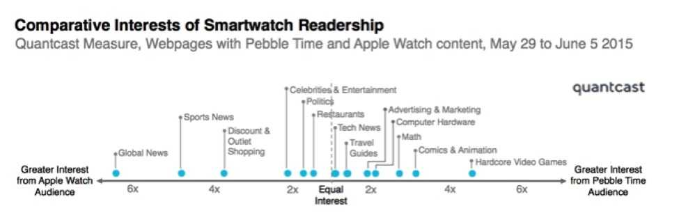 根据Quantcast Measure的数据,我们研究了含Apple Watch网络内容的用户,并与Pebble Time的受众进行了比较。